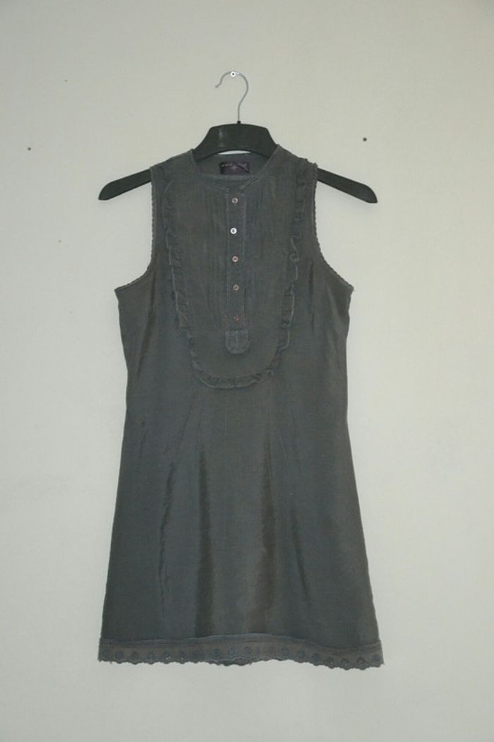 Robe gris anthracite marque one step. Forme chasuble. Ouverture devant par boutons. Coupe droite. Détail dentelle devant et bas.