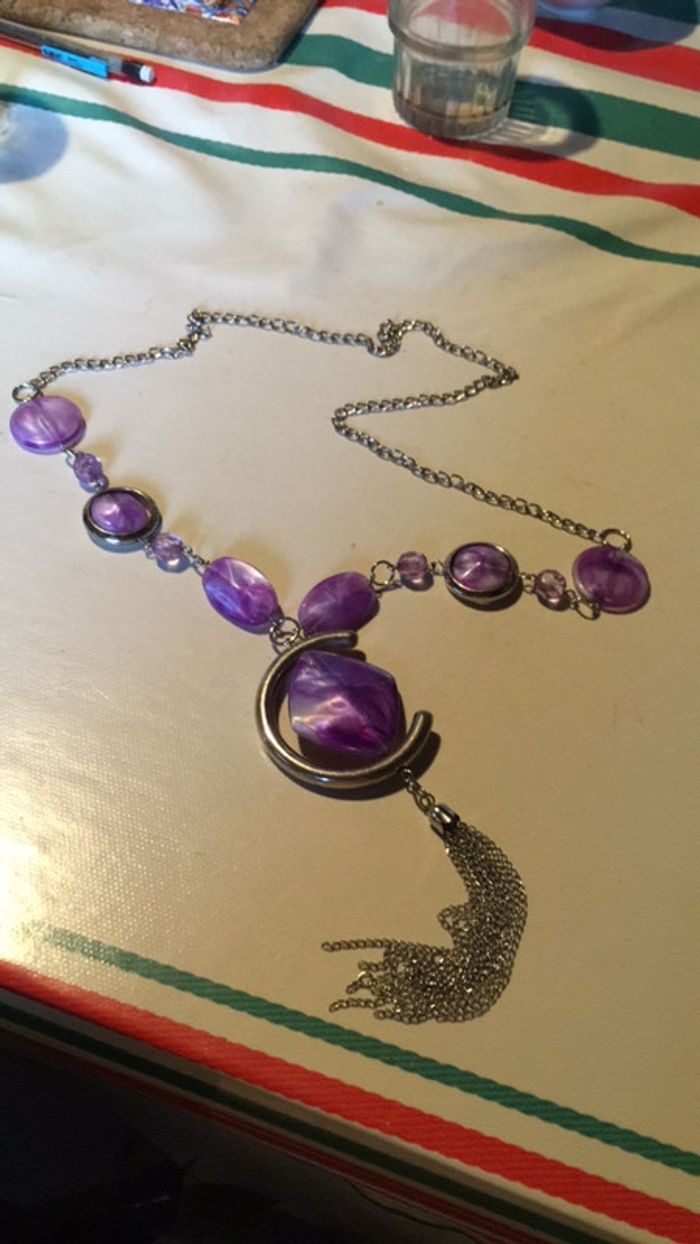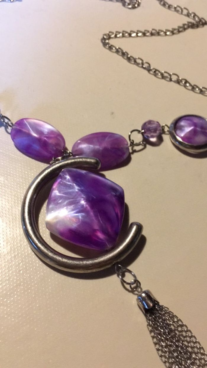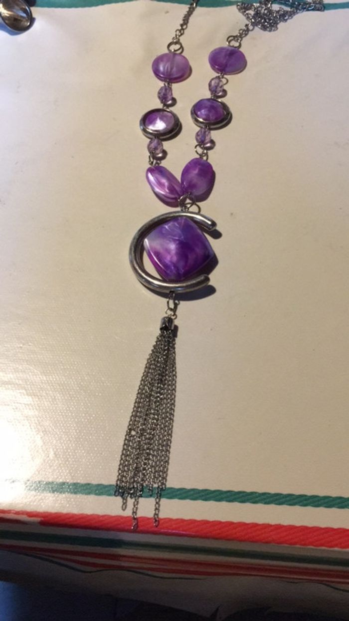 Beau sautoir parme et argenté très bon état de 52 cm avec la pampille sans il fait 38 cm. S’enfile par la tête
