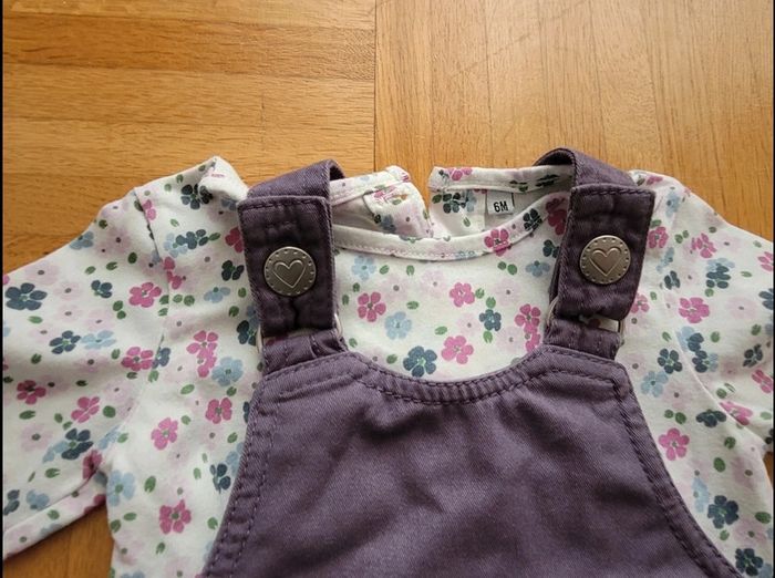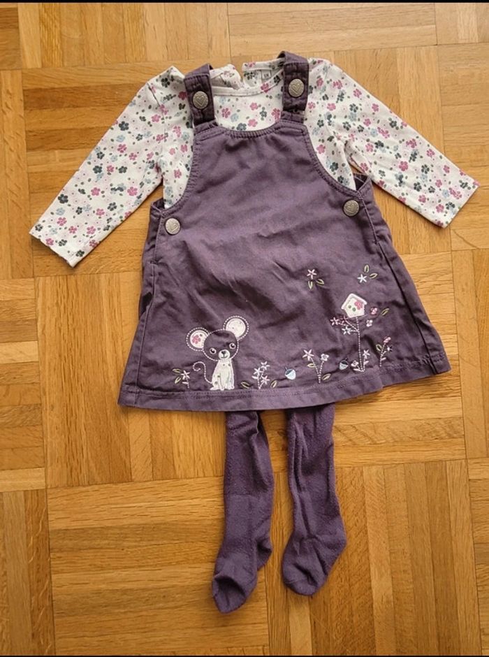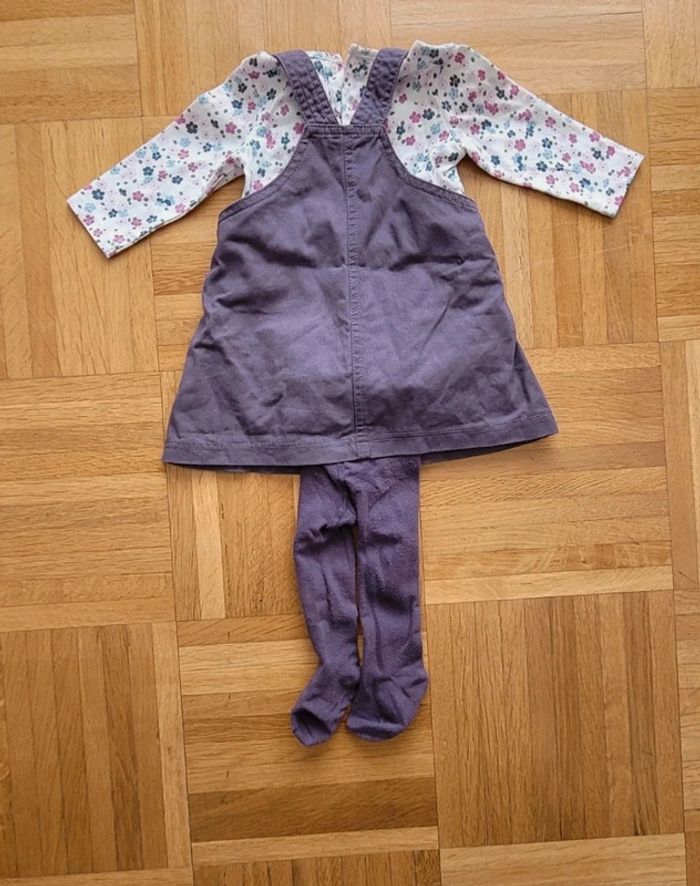 Tenue complète violette avec une robe salopette violette, un haut blanc à motifs fleuris et collants assortis. 6 mois