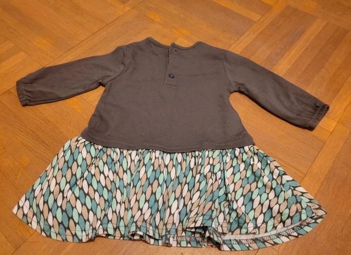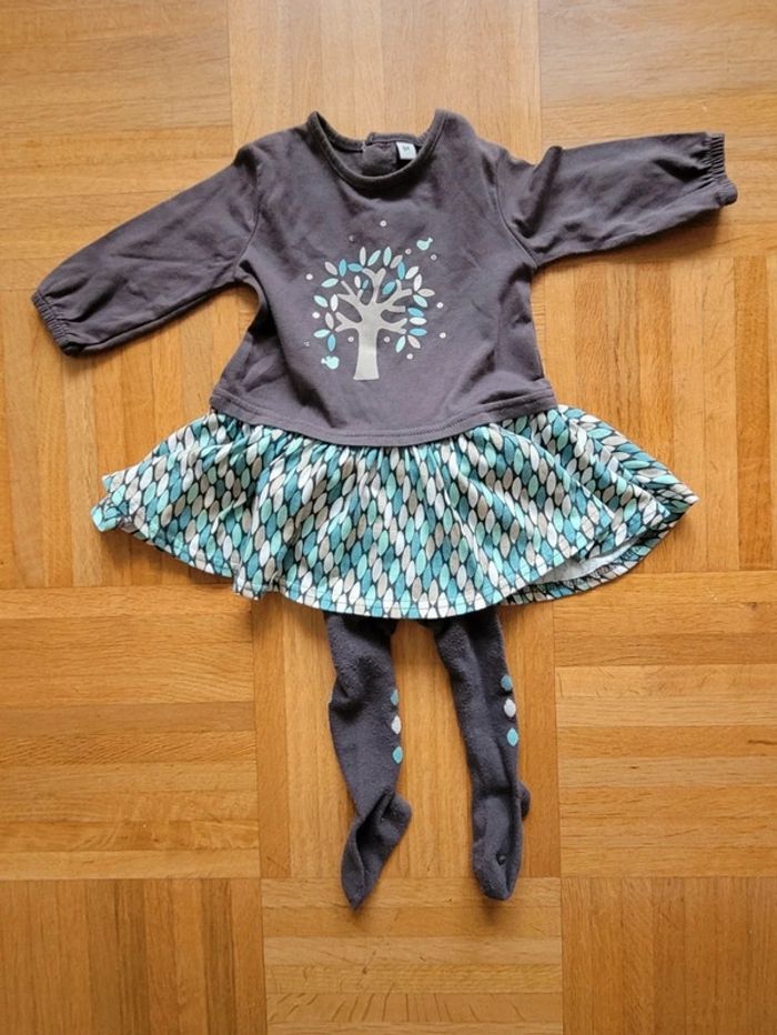 Robe gris taupe à motif arbre sur le haut, motifs feuilles sur le bas et collants assortis. Jamais portée.