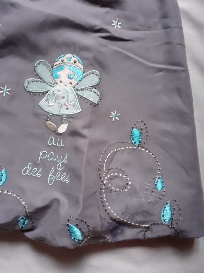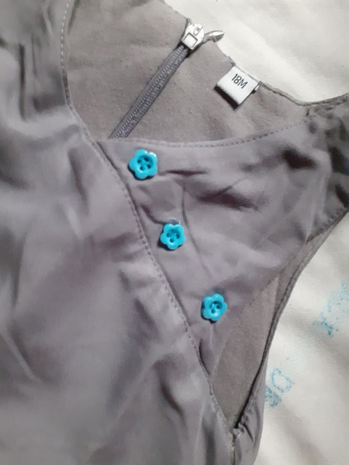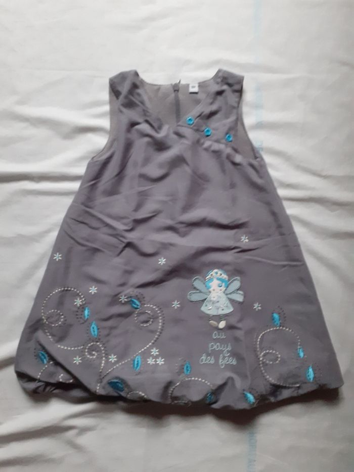 Robe grise bouffante avec boutons fleurs turquoises motif fée 18 mois
