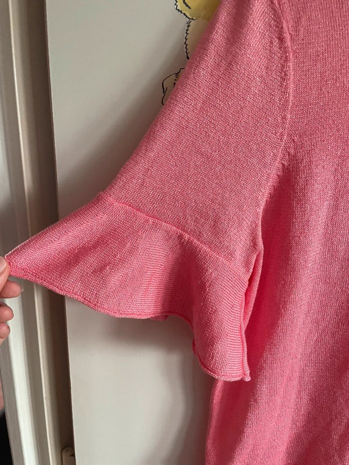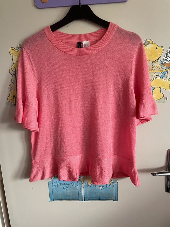 🌸 Tee shirt à manches courtes rose pailleté à volants 🌸 On ne le voit pas bien sûr les photos mais il y a bien des paillettes 🌸 Taille S 🌸 Marque H&M 🌸 Très bon état, hormis un fil tiré voir photo 4