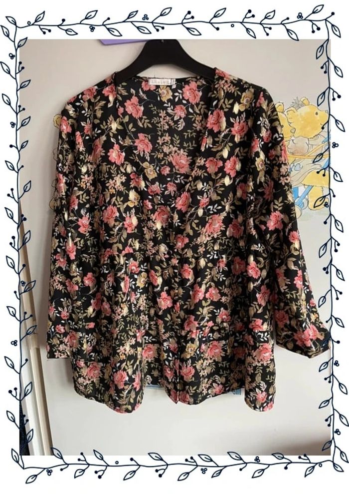 Blouse noire à fleurs et à motifs dorés, taille M, marque Lili & Lala