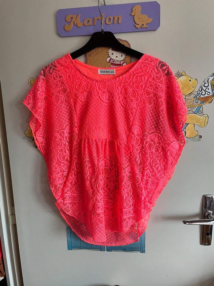🌸 Magnifique haut/blouse rose fluo avec manches chauve souris en dentelle 🌸 Doublure sur la partie du buste 🌸 Taille 14 ans 🌸 Marque Jolie Miss, boutique parisienne 🌸 Très bon état