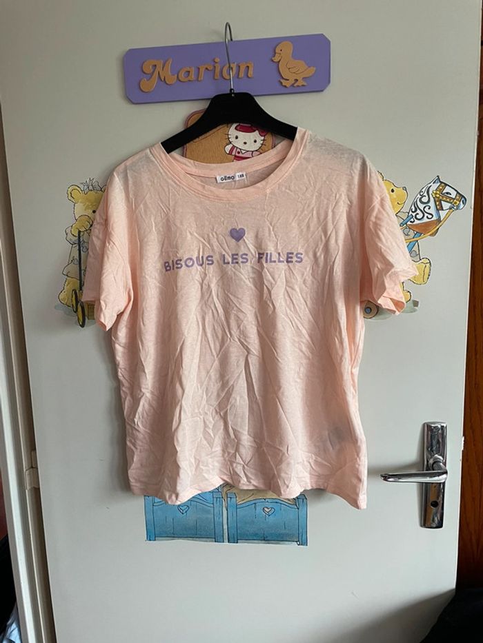 Tee shirt à manches courtes pêche-abricot avec inscription bisous les filles, taille Xs, marque Gemo - photo numéro 2