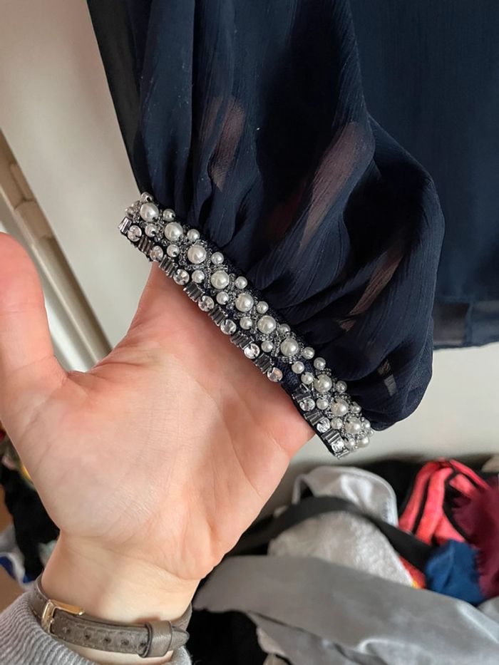 Blouse bleu marine avec perles sur les manches, taille 36, marque Atmosphère - photo numéro 2