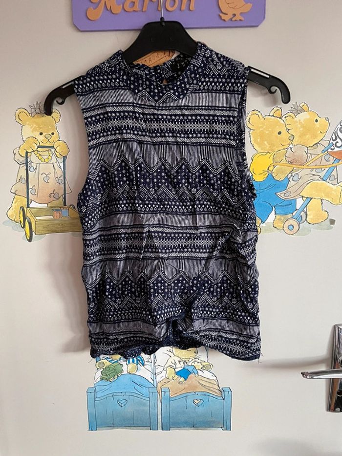 Haut sans manches bleu marine et blanc à motifs, taille 34, marque Jennyfer.