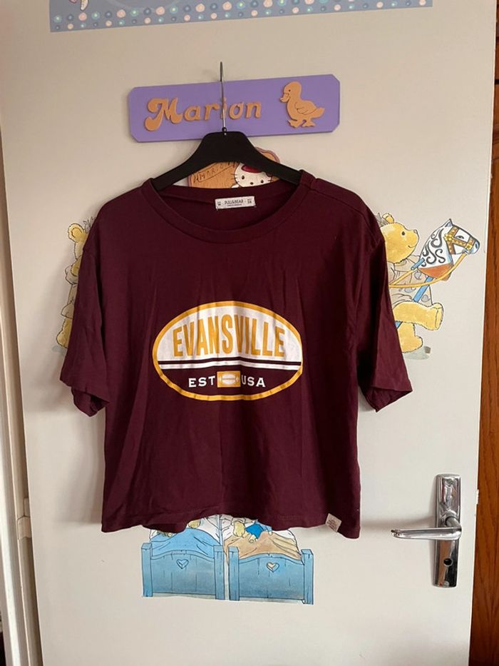 Tee shirt à manches courtes bordeaux à motifs, taille M, marque Pull & Bear.