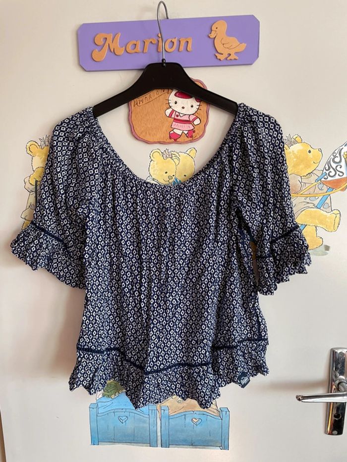 Top à épaules découvertes à motifs bleu et blanc, taille S, marque Superdry. - photo numéro 1