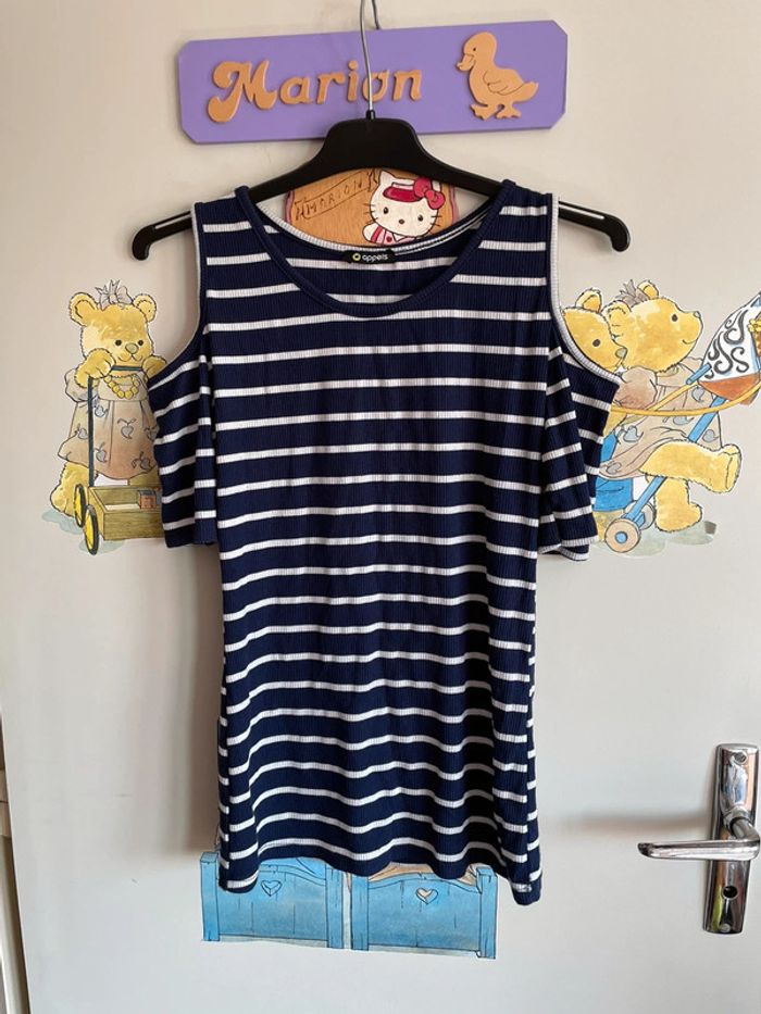 Top à épaules découvertes bleu marine à rayures blanches, taille 36, marque Appels. Il n’y a pas l’étiquette de taille