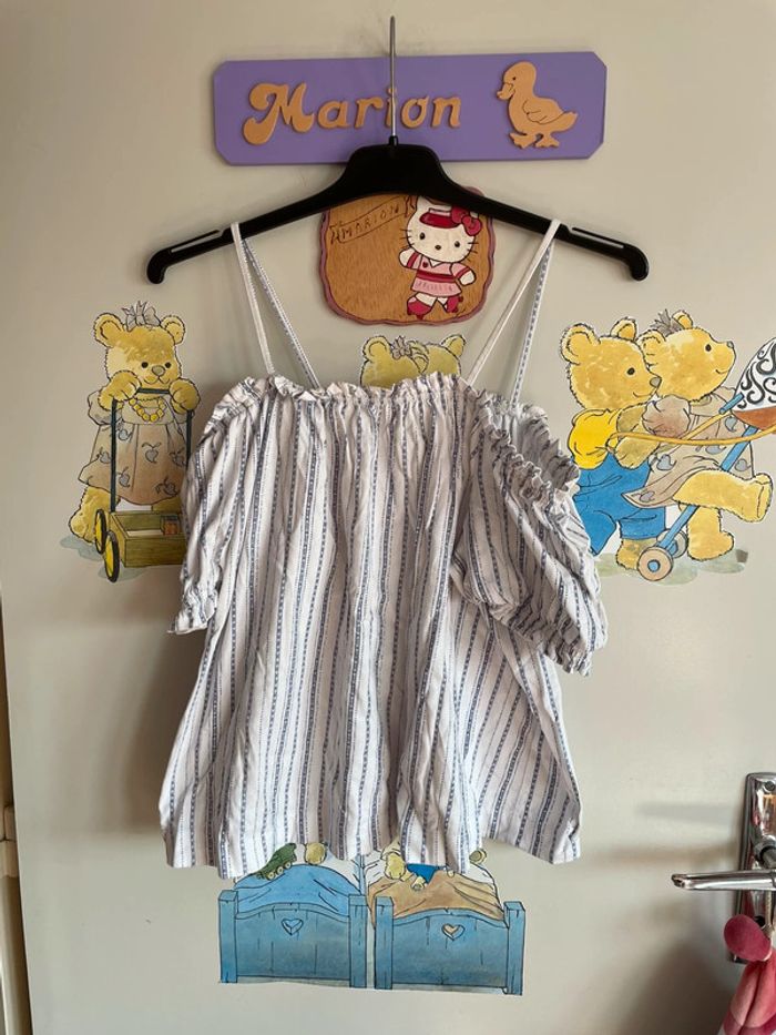 Tee shirt à manches courtes à épaules découvertes à rayures blanches et bleues, taille Xs, marque H&M.