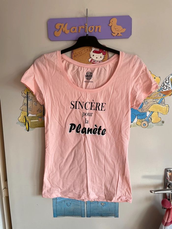 Tee shirt à manches courtes rose à motifs, taille S, marque Sincère.