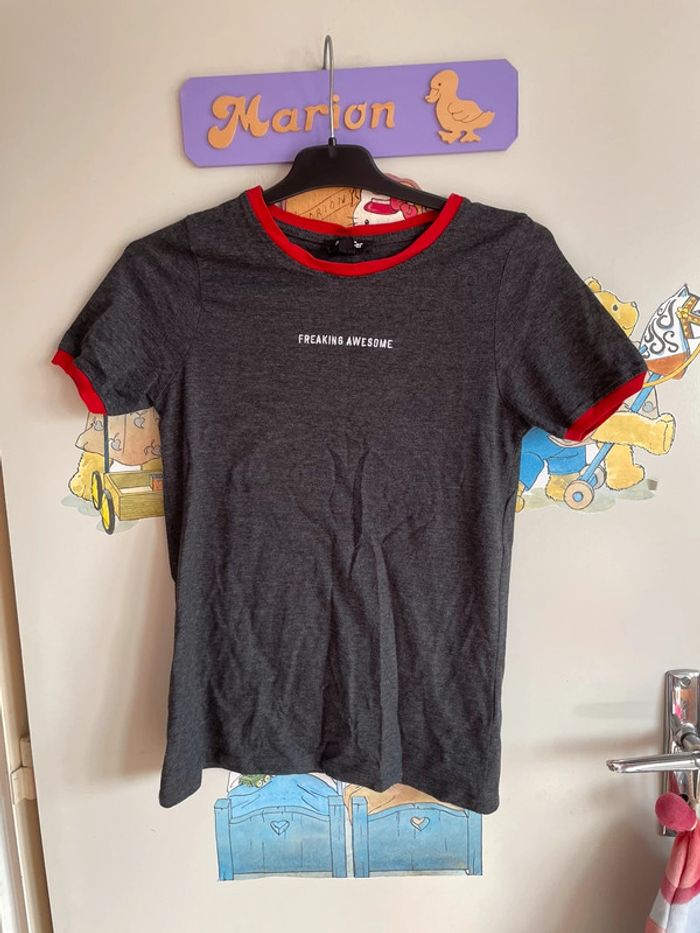 Tee shirt à manches courtes gris foncé et rouge à motifs, taille Xs, marque Jennyfer