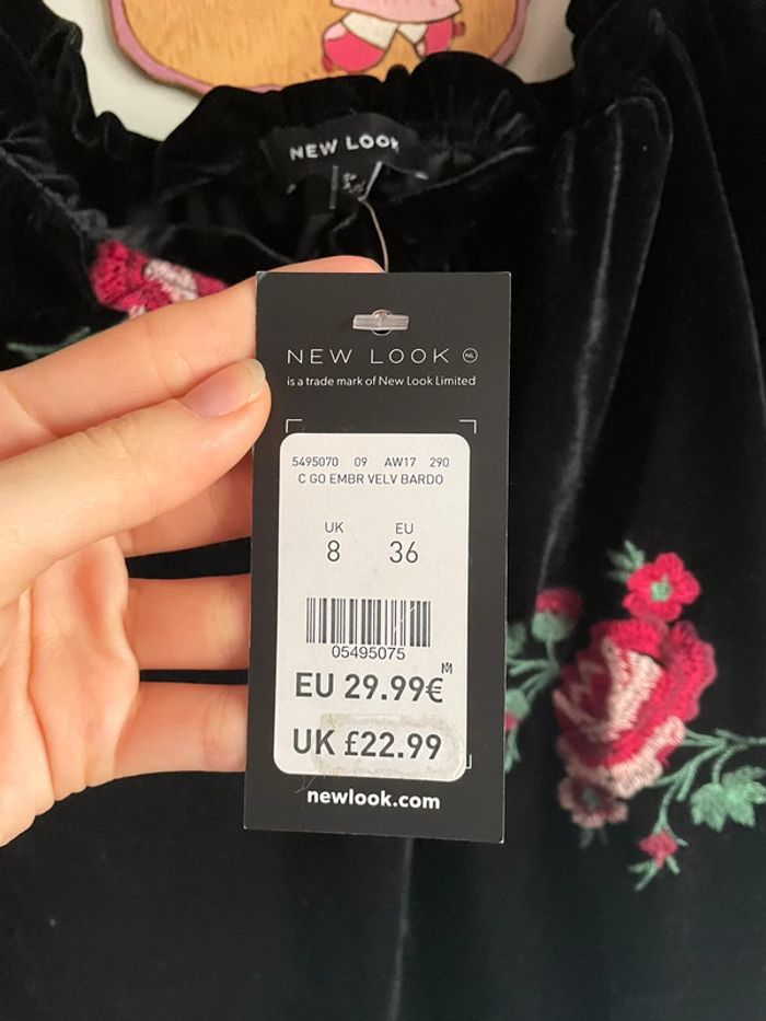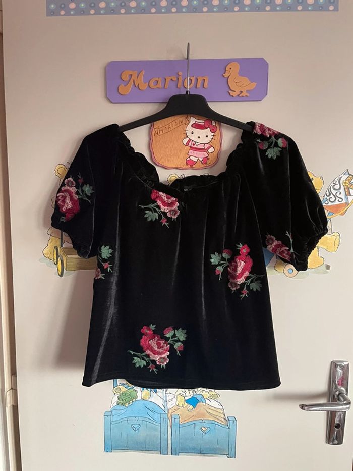 Haut à épaules découvertes en velours noir à motifs fleurs, taille 36, marque New Look. - photo numéro 2