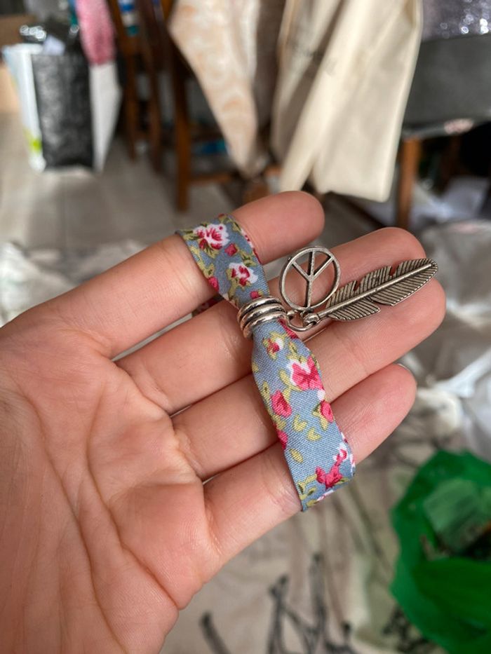 Bracelet tissu avec breloques plume et Peace. - photo numéro 1
