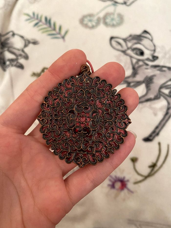 Collier rose avec breloque ronde motifs arabesque.