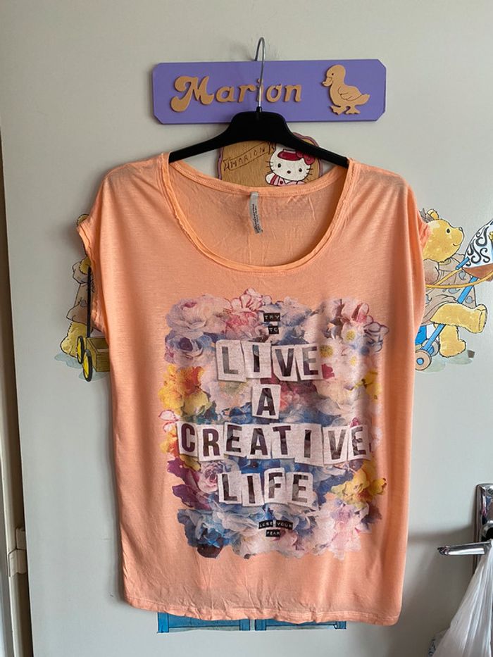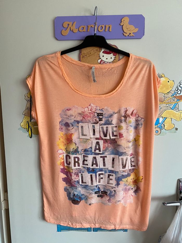Tee shirt à manches courtes à motifs, taille S, marque Stadivarius. Il est plus peps que sur la photo.