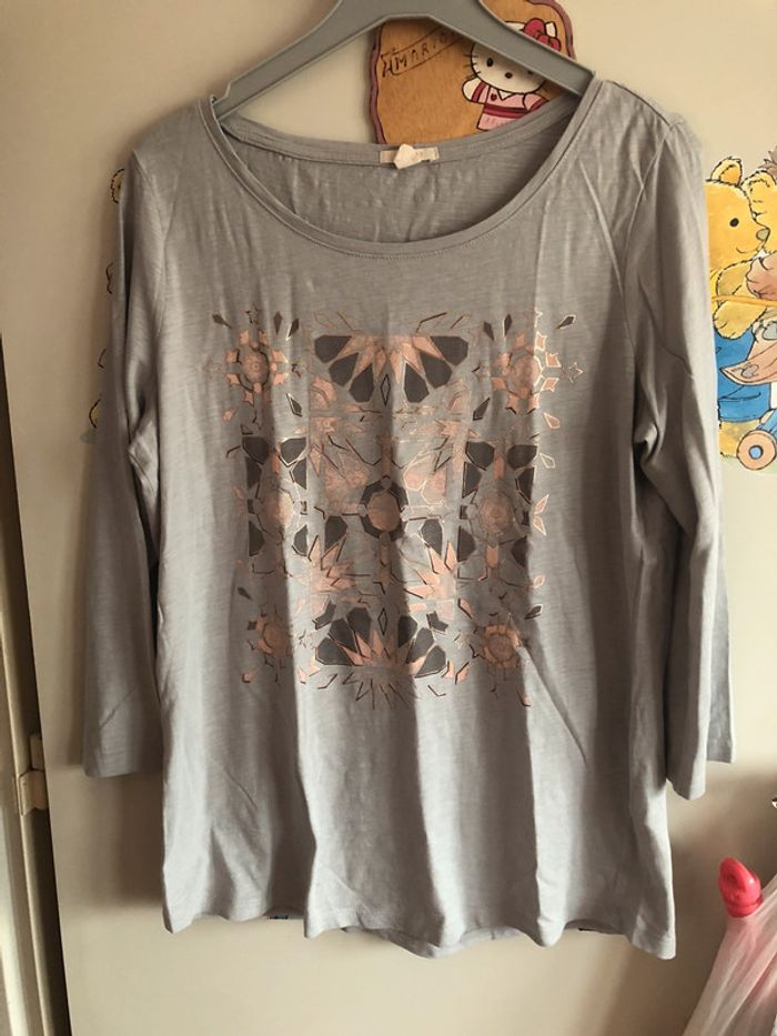 Tee shirt à manches 3/4 gris à motifs, taille M, marque Esprit.