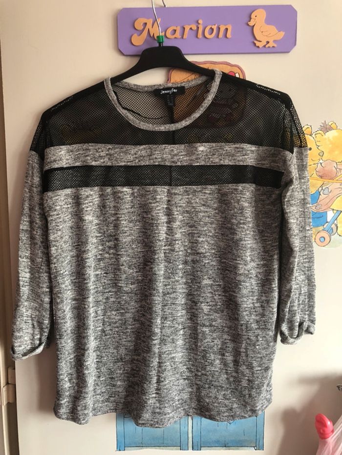 Tee shirt gris et noir à manches 3/4, taille S, marque Jennyfer.