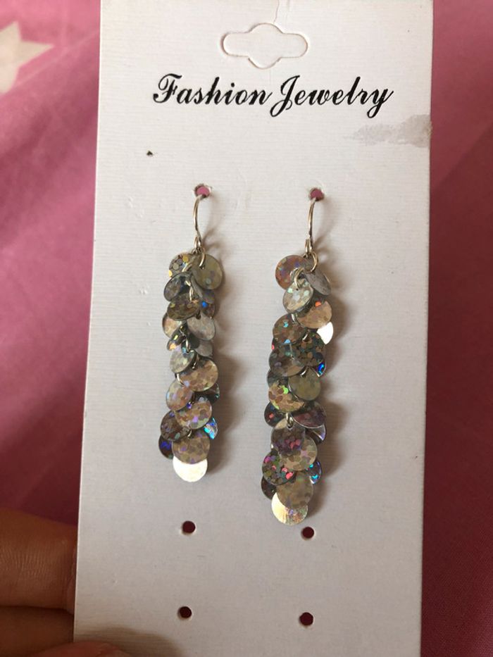 Très jolies boucles d’oreilles gris pailleté, marque Claire’s.