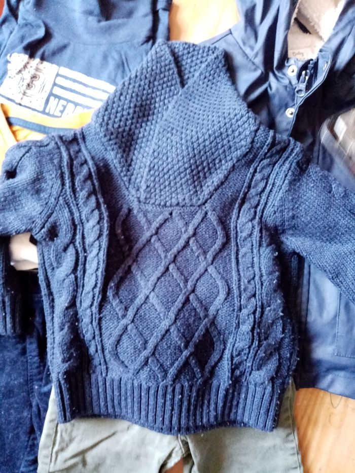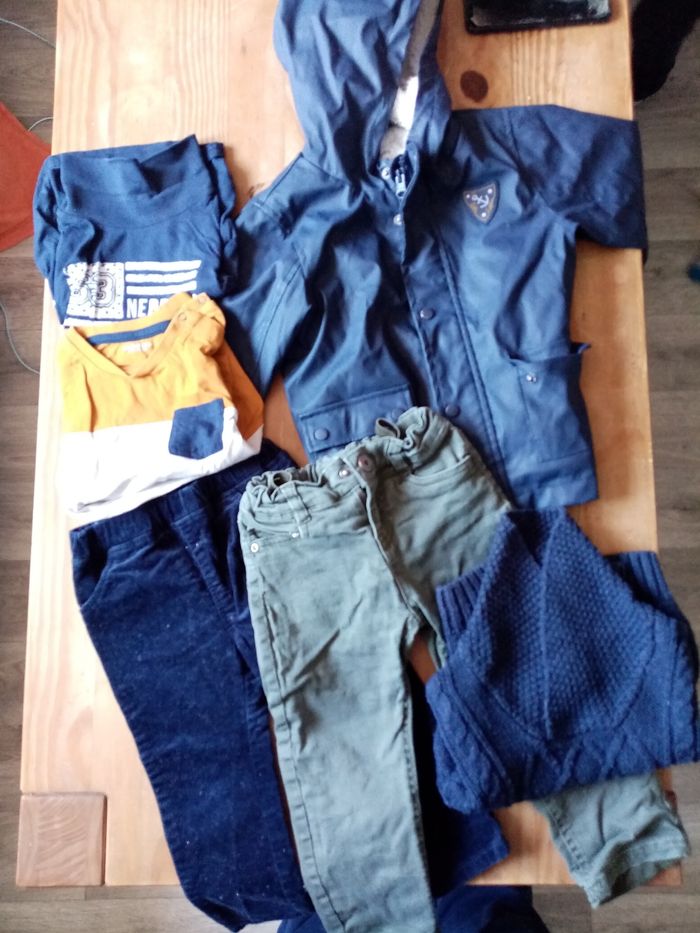 2 pantalons 2 manches longues dont un col roulé 1 pull légèrement bouloché 1 veste coupe vent imperméable doublé polaire (parfait état juste les boutons qui ont perdu un peu de peinture) #annelore24mois