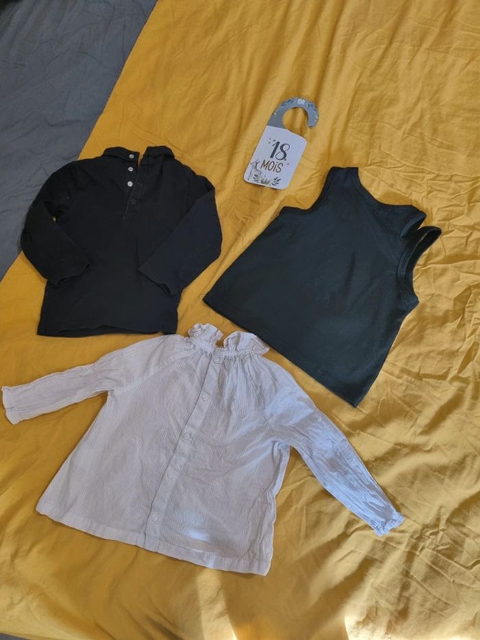 Lot 3 t-shirt 18 mois Un débardeur noir taille 12-18 mois shein Une blouse blanche manches longues Kiabi 18 mois avec boutons dans le dos Un t-shirt manche longue noir Kiabi 18 mois #solene18mois