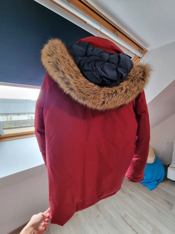 Parka doudoune chaude hiver homme Tommy Hilfiger Capuche moumoute Comme neuf Très peu porté car trop grand Acheté 400€ aux galeries Lafayette Couleur rouge bordeaux Taille M