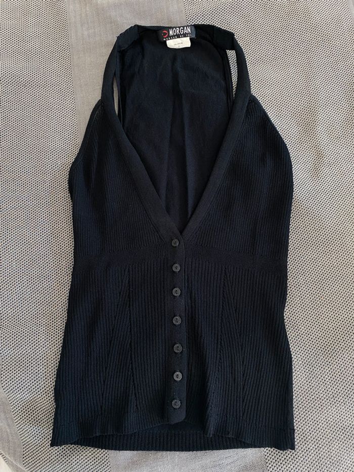 Top noir gilet débardeur Marque Morgan Taille 1 = S Style original façon gilet garçon de café Boutons sur l'avant Martingale au dos qui permet de le cintrer plus ou moins Maille gilet texturé Dos épaules très dégagée limite dos nageur