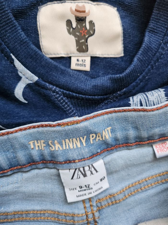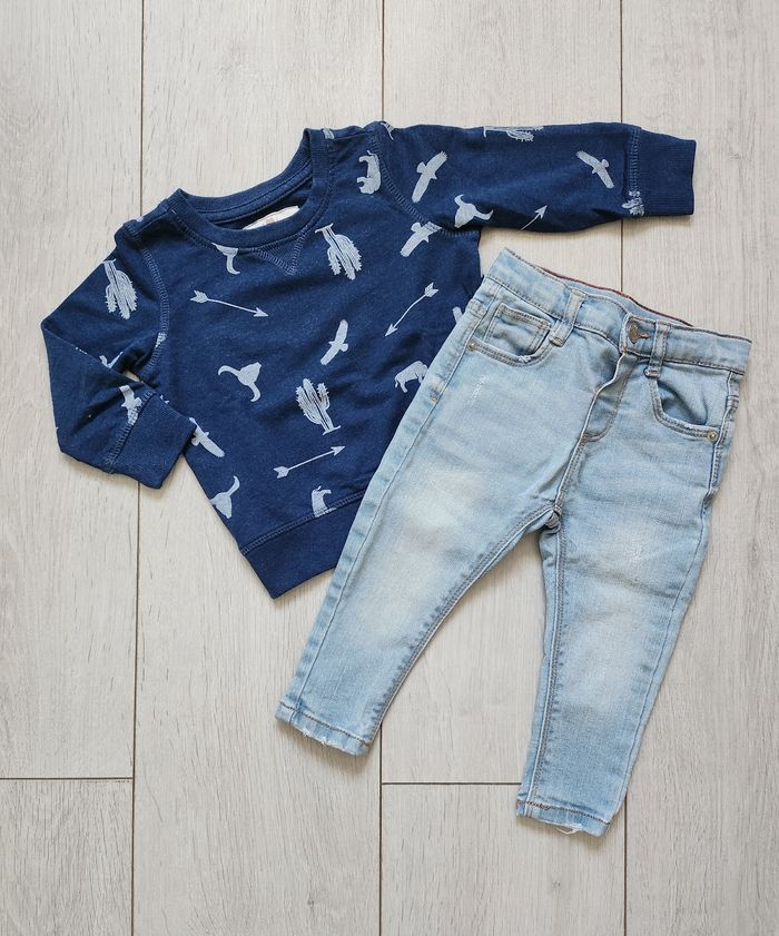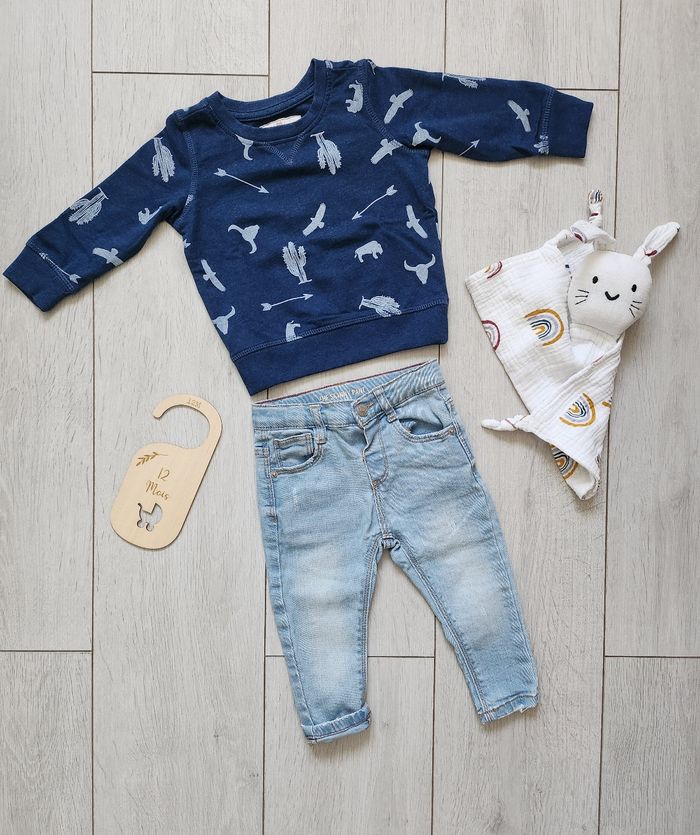 Très bel ensemble en parfait état. 1 Pull bleu à imprimé et un Jean clair Zara. Taille 12 mois.