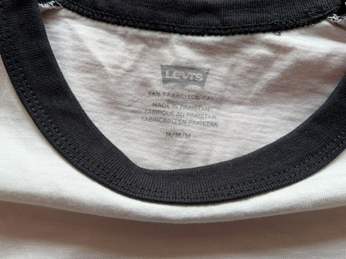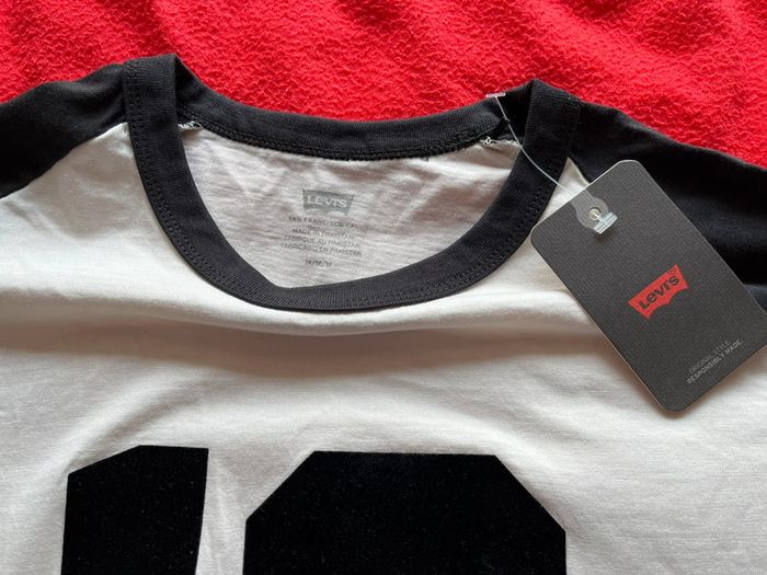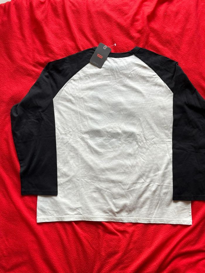 Manches longues. Bicolore écru et noir. Chiffre imprimé devant en velours. Dos uni. Coupe large. Etiuette de la marque à la base du tee-shirt. Jamais porté. Composition 100% coton. Mesure d'aisselle à aisselle 60 cms. Longueur 68 cms.