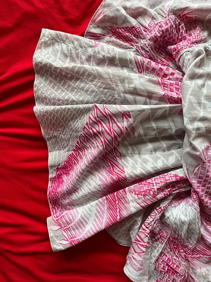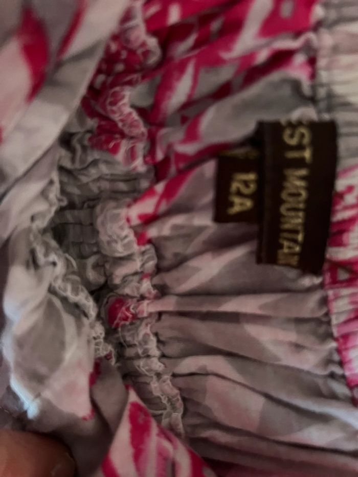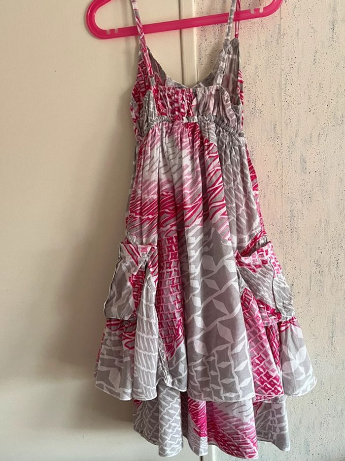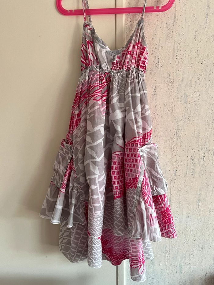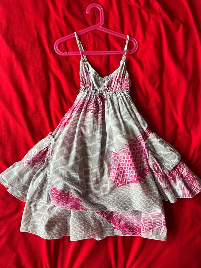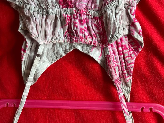 Couleur gris et rose. Entièrement doublée. Coupe ample. Poitrine élastique. Côté fantaisie avec poche. Bretelles réglables. Matière 100% coton. Aucun défaut.