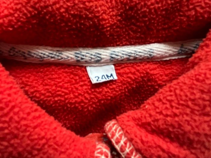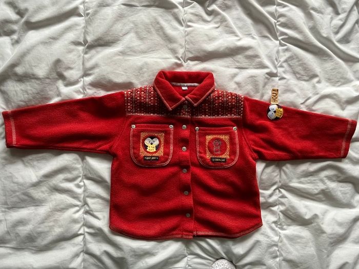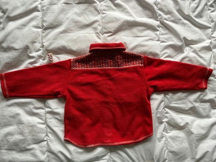 Manches longues. Poches devant. Fermeture par bouton pression devant. Motifs devant et dos. Base arrondie.
