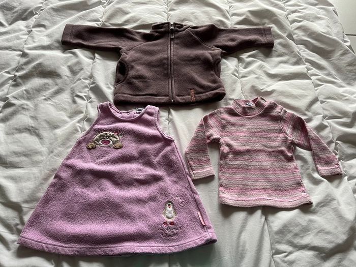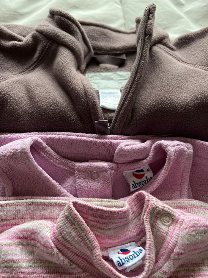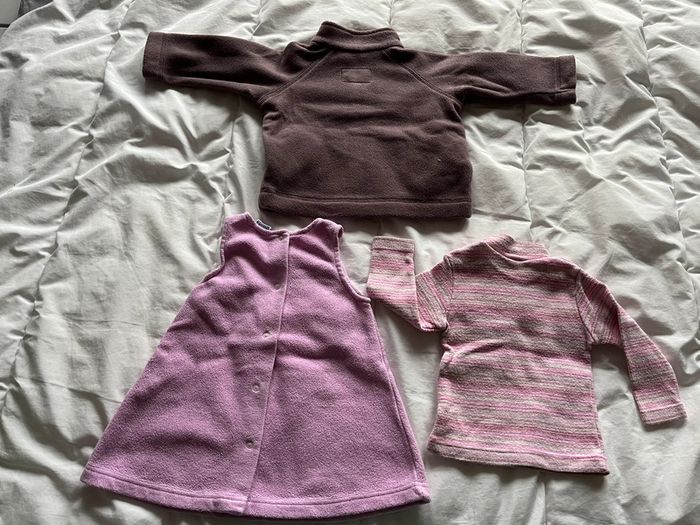Lot composé d'un ensemble robe et tee-shirt Absorba et d'une polaire Décathlon. Ensemble Absorba : robe sans manches en polaire. Patte de boutonnage au dos sur toute la longueur. Motif devant et dos uni. Tee-shirt à rayure col montant. Patte de boutons pressions sur l'épaule gauche. Polaire Décathlon. Poches devant. Col montant. Fermeture par zip. Devant et dos uni.