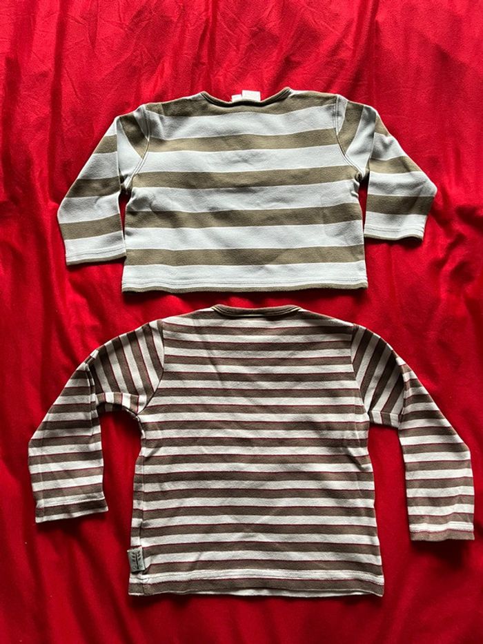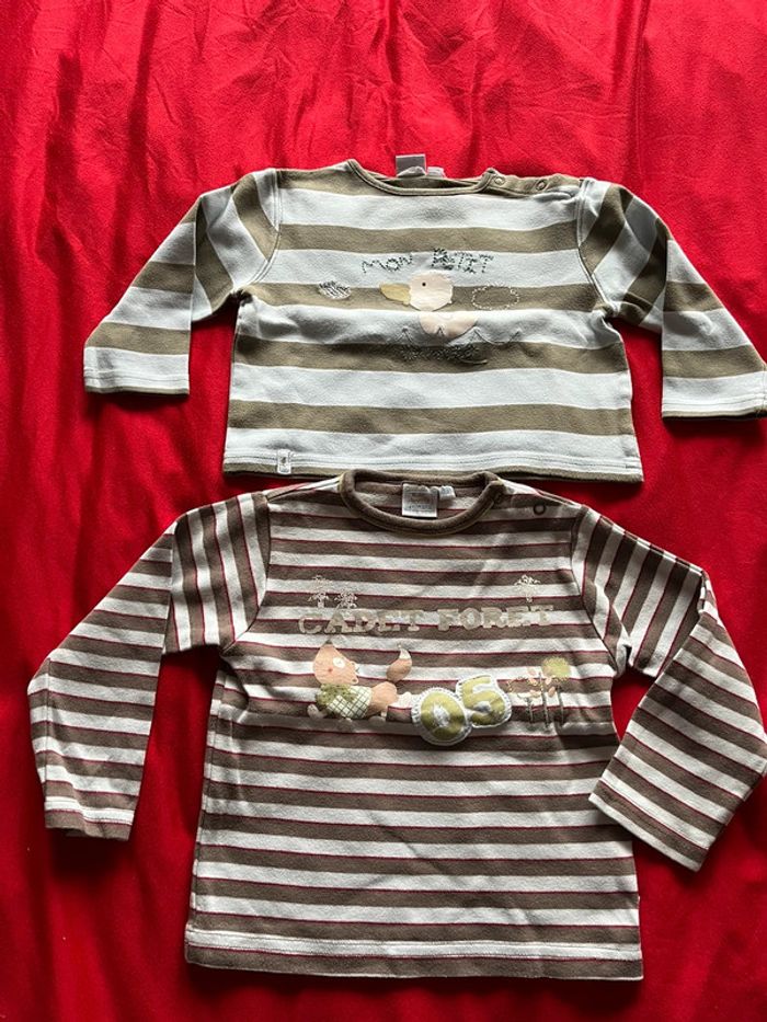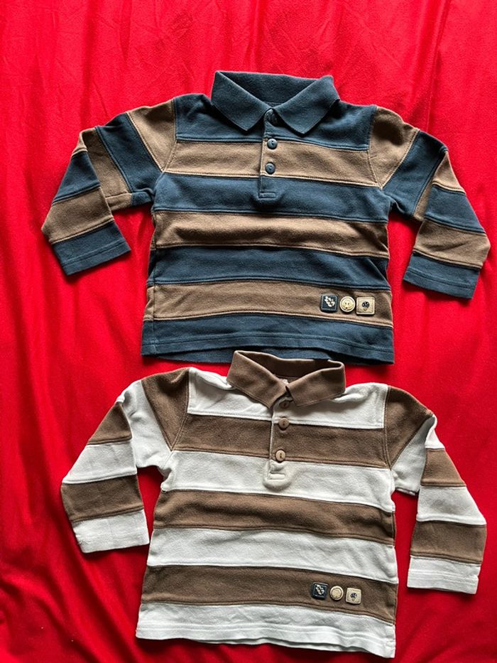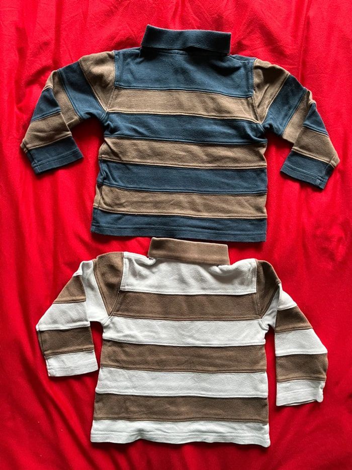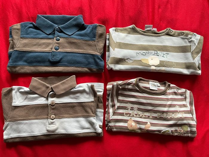 Lot composé de 2 tee-shirts et de 2 polos. Tee-shirts à rayures avec motifs devant. Boutons pressions sur l'épaule. Polos avec patte de boutons classique devant. Motifs devant. Souvent portés.