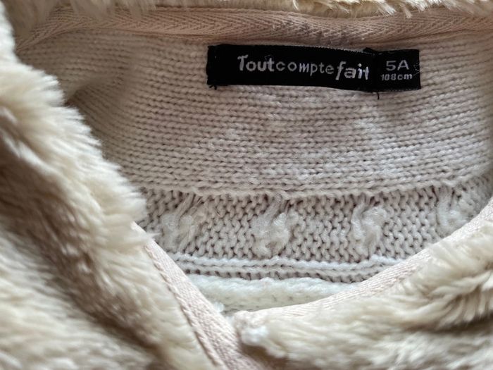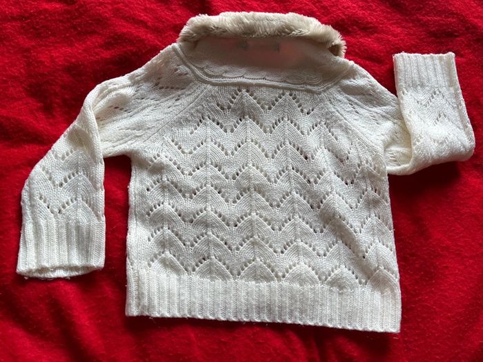 Gilet ajouré. Col fausse fourrure. Fermeture par boutons devant. Base du gilet et des manches côtelée. Composition acrylique et polyester.