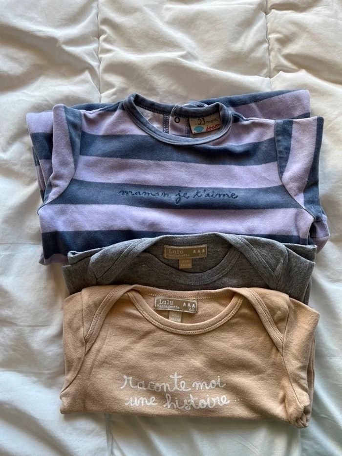 Dors-bien en velours bleu et gris. Texte devant « maman je t’aime ». Boutons pression au dos. 2 tee-shirts Lulu et Castagnette : 1 couleur camel et 1 gris. Col rond . Inscription devant. Dos uni.