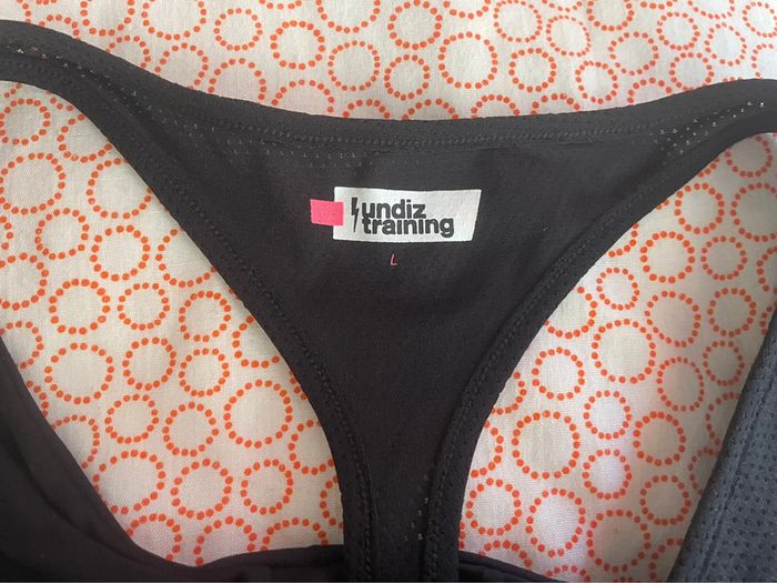 Haut de sport avec la brassière intégré. Taille très petit (noté L mais plutôt un S voire un M)