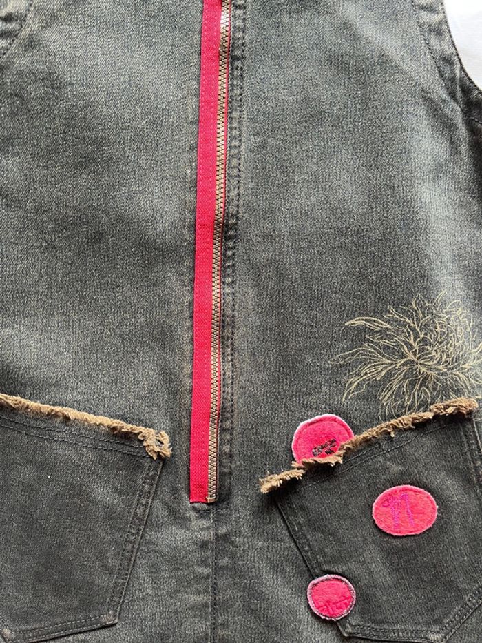Fermeture par zip devant. Poches devant. Ecussons fantaisie devant. Dos uni. Couleur noir délavée. Matière douce au toucher. Non doublée, jean épais. Longueur 60 cm