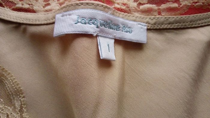 Petites pinces poitrine. Col et base du du top en dentelle. Col en V. Coupe cintrée. Matière fluide. Composition 100% polyester. Largeur d'aisselle à aisselle 44 cm. D'épaule à épaule 42 cm. Longueur 60 cm.