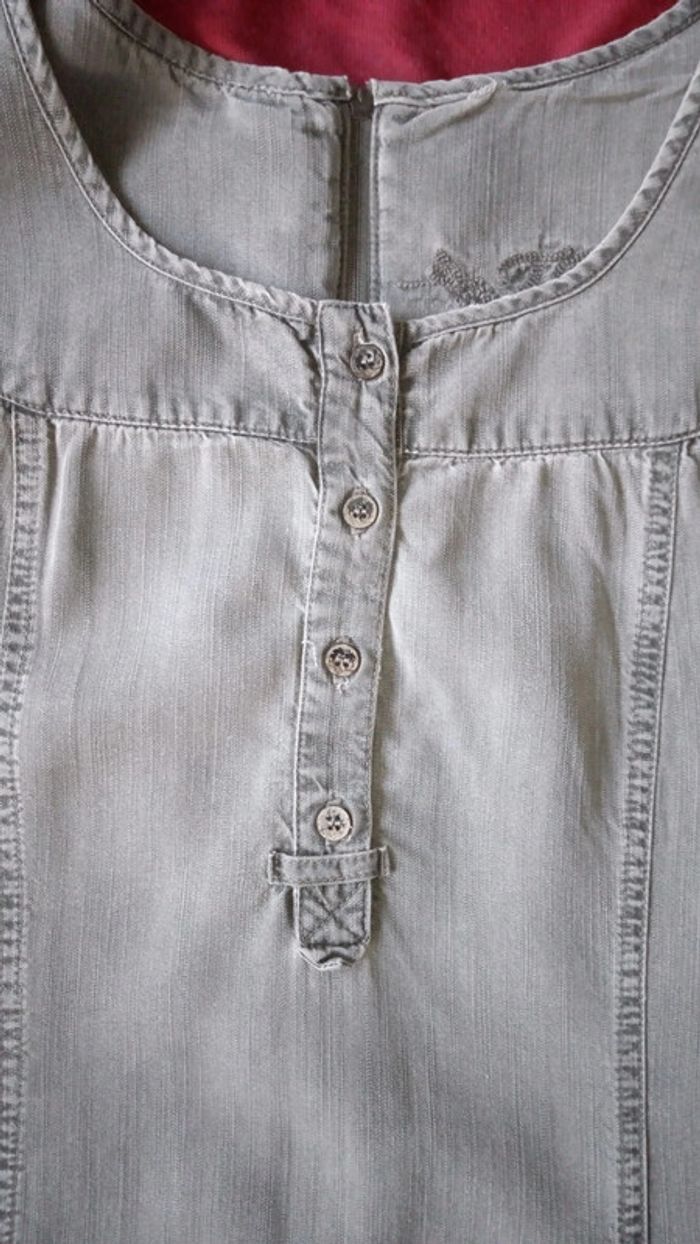 Robe longue grise sans manches. Patte de boutonnage devant. Fermeture par zip au dos. Composition 100% lyocell. Mesures : Épaule à épaule 33 cm, aisselle à aisselle 44 cm, longueur 108cm