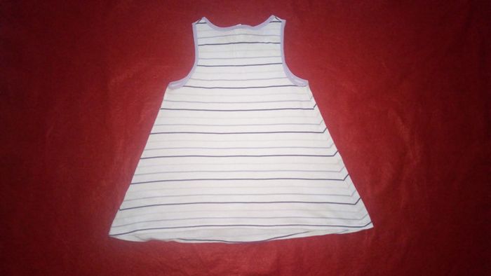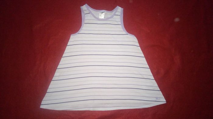 Débardeur à rayures. Col rond. Coupe évasée. Rayures parme, bleues et blanches. Composition 100% coton.