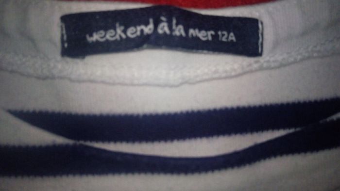 Col rond. Rayures blanches et bleues. Coupe légèrement évasée. Composition 100% coton.
