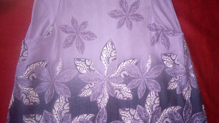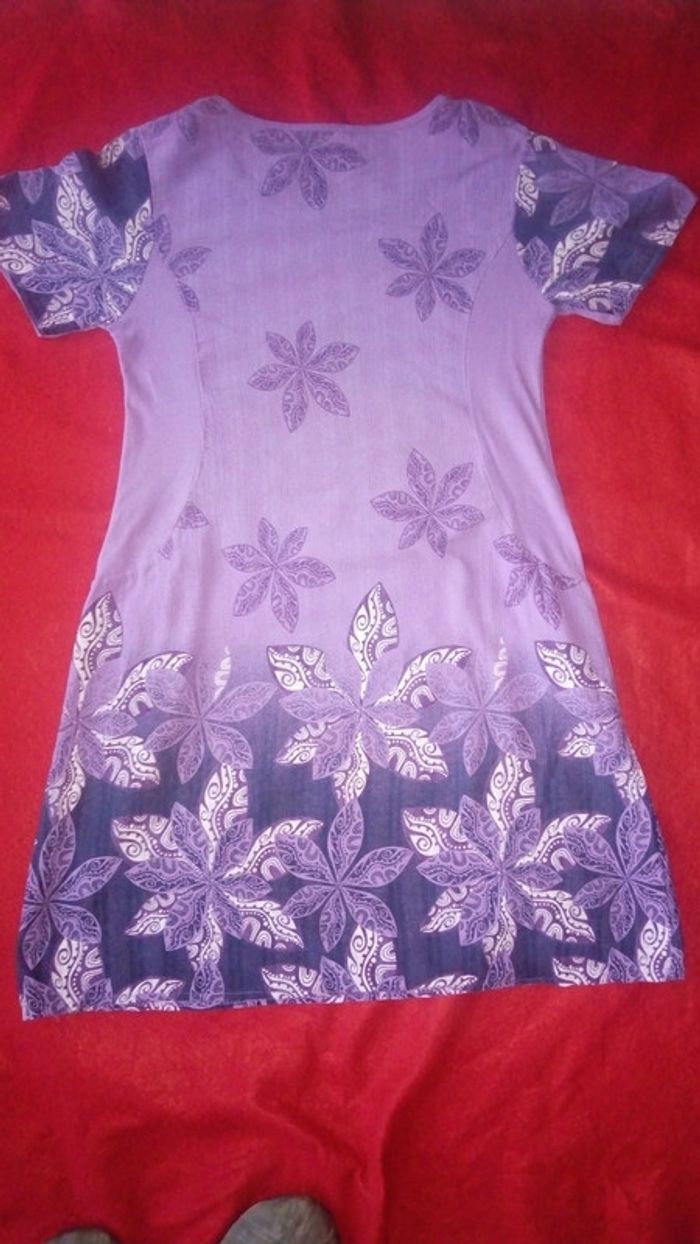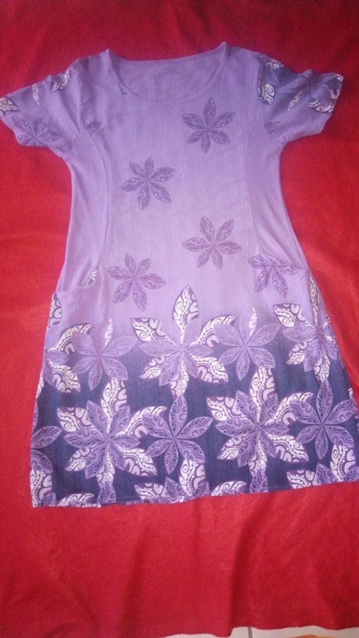 Jolie robe violette manches courtes. Col rond. Poches latérales. Mesure d'aisselle à aisselle 46 cm. Longueur 93 cm. Composition 90% coton, 10% élasthanne.