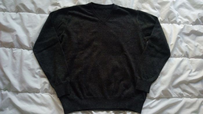 Col en V. Base des manches et du pull côtelée. Composition 55% laine mérinos