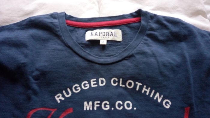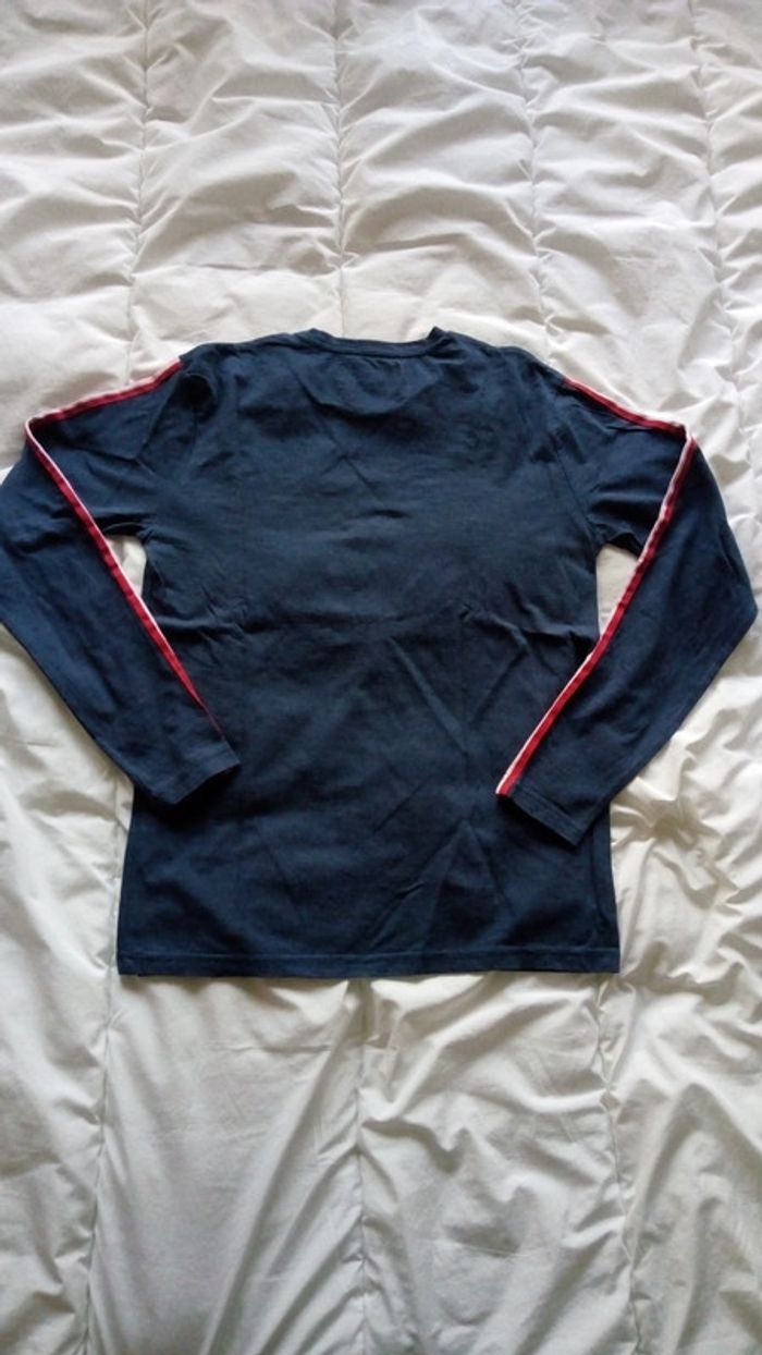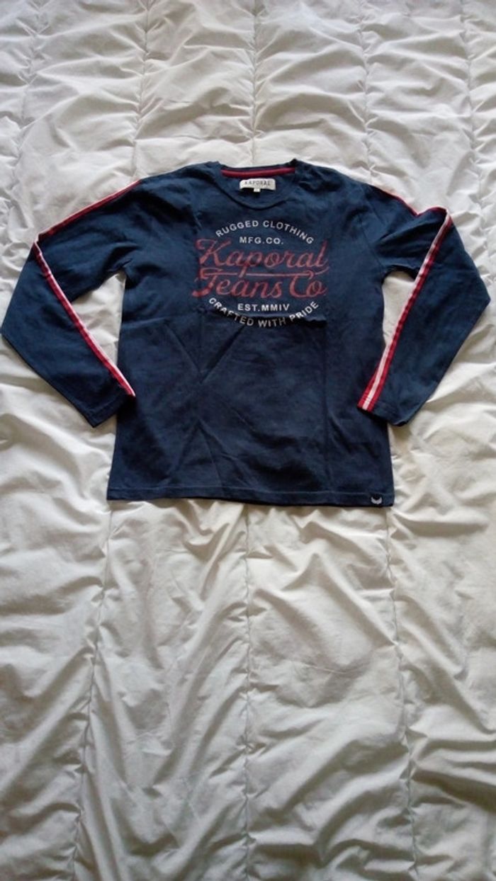 Tee-shirt bleu manches longues Kaporal. Col rond. Impressions devant et dos uni. Bandes colorées sur chaque manche. Composition 100% coton.