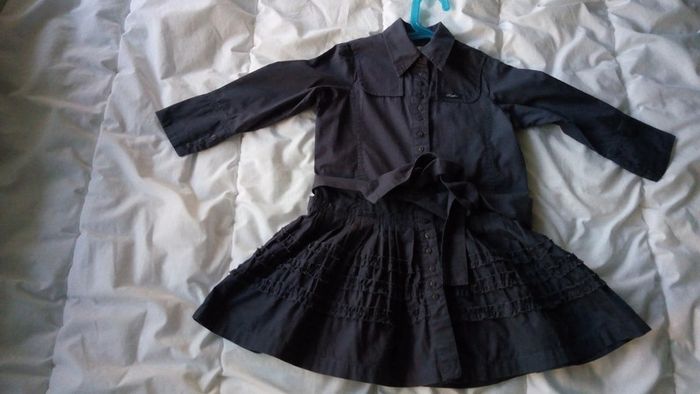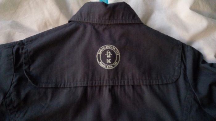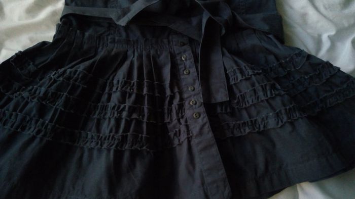 Manches longues. Fermeture par boutons devant (vrais et faux boutons). Ceinture à nouer à la taille. Composition 100% coton. Robe arrivant aux genoux. Couleur est bleu gris. Aucun défaut. Portée 1 fois.