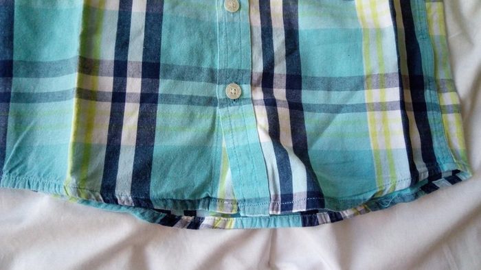 Chemise à carreaux bleus à manches courtes. Matière légère. Base arrondie. Poches poitrine. Composition 100% coton. Très peu porté. Aucun défaut. Pantacourt en jean, taille ajustable par élastique. Poches devant et derrière. Patte de boutonnage 1 bouton et zip. Composition 100% coton. Aucun défaut.
