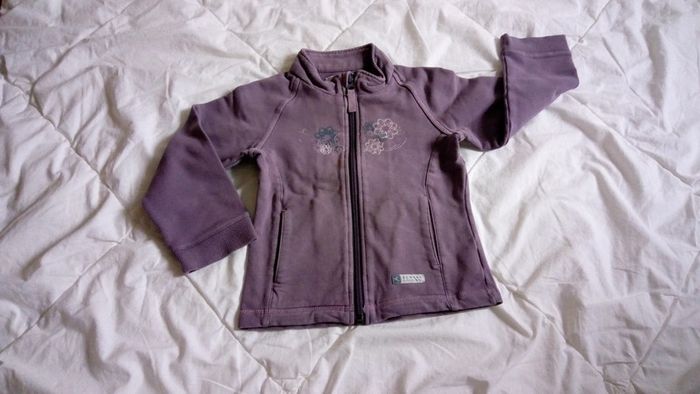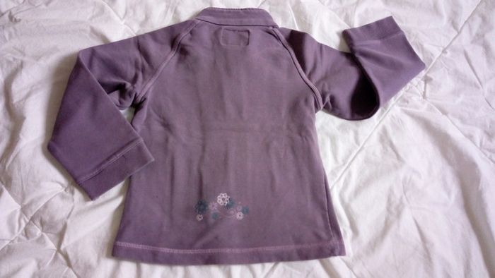 Sweat zippé violet manches longues. Fermeture par zip. Poches kangourou. Col légèrement montant. Broderies devant et au dos. Composition 95% coton, 5% élasthanne. Aucun défaut.