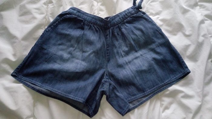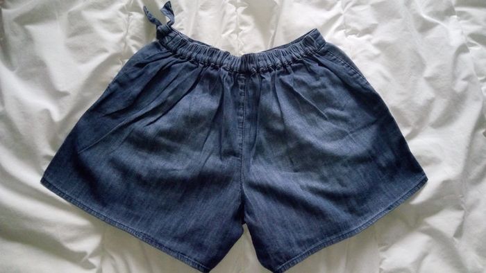 Short bleu jean uni. Poches sur les cotés. Taille élastique au dos. Petit noeud sur le côté. Matière 100% coton. Très peu porté. Aucun défaut.