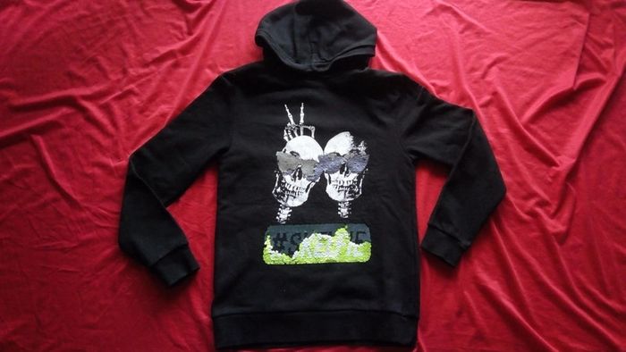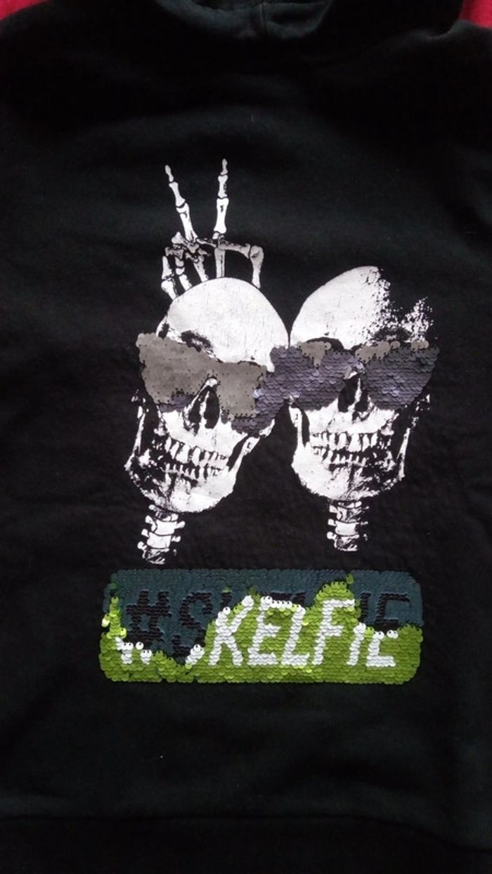 Sweat à capuche noir. Bord des manches et base du sweat côtelé. Motif tête de mort devant. Dos uni. Composition 88% coton, 12% polyester.